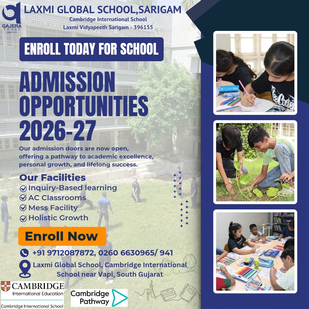 Laxmi Global School is a unique Cambridge International school located at Sarigam in Valsad district, South Gujarat. Lapped in the cradle of nature, we are spread over a lush green scenic and serene 120 Acres campus. The campus can be accessed by a 2 Hrs. journey from Mumbai International Airport & Surat City. LGS is situated at the tranquility of Laxmi Vidyapeeth, a campus away from the crowd of the city.